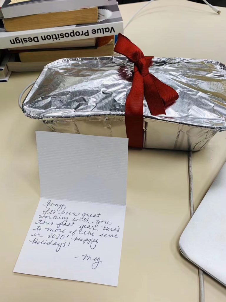 理解这个核心理念,可以帮助你吸引你想吸引的一切事物和人,适用于品牌的打造和任何人际关系,就如我和我的同事们,虽然他们都是美国人,但是他们还是非常喜欢和我一起工作,倒不是因为我给他们发了工资,而是因为我们每一次品牌打造都是在创造和传递美好的过程,我想这份“美好的情感”才是让我们链接的关键所在。就如这张照片里的同事MEG(我们的品牌战略文案),在感恩节的时候特意给我送来了一份她自己做的蛋糕,还给我手写了一份卡片,我觉得那份幸福感是很强烈的,这张卡片我一直放在我手提包里,格外的珍惜。所以你会发现,真正可以让我们在一起工作这么多年的,绝对不是工资那么简单,而是我们有一个共同的愿望,那就是我们通过自己的工作打造美好的品牌影响我们的客户,我们的客户通过这个美好的品牌积极影响周围的人以及更多的外部客户,这对我们来说真的是一种莫大的动力,用老话说,这个是积累福报和功德。无论是传播美好还是传播善的力量,都是超越国家界限的。