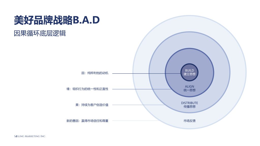 美好品牌战略B.A.D就是这样一颗可以成就你的好种子,在这个三位一体的模型中TEMPLATE:BUILD建立思想解决了商业如何存在的问题;ALIGN统一思想解决了企业如何驱动的问题;DISTRIBUTE传播思想解决了企业如何被感知的问题。所以一个真正的品牌是这三者在崇高使命下的完美融合与和谐共生,而品格(企业的德行)成为其最强的竞争优势。这三个概念需要共同运作以构建一个高信任、高效率、高使命感的良性循环生态系统,整个过程可以看作一个由内而外、自我能量的提升和从内到外的因果循环。