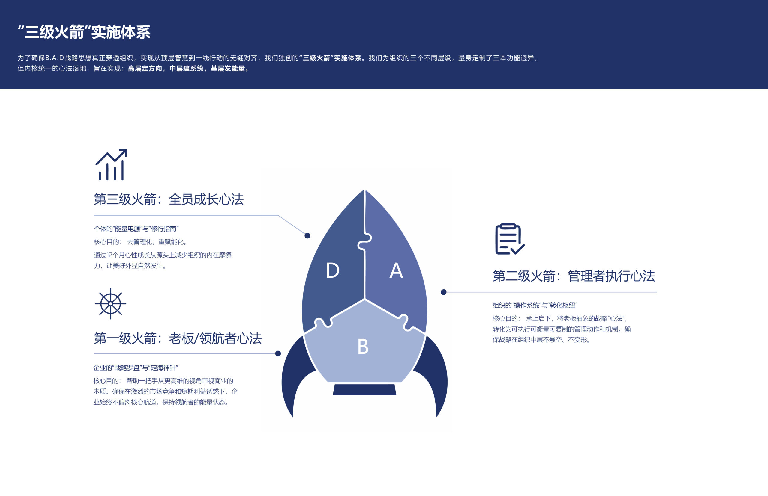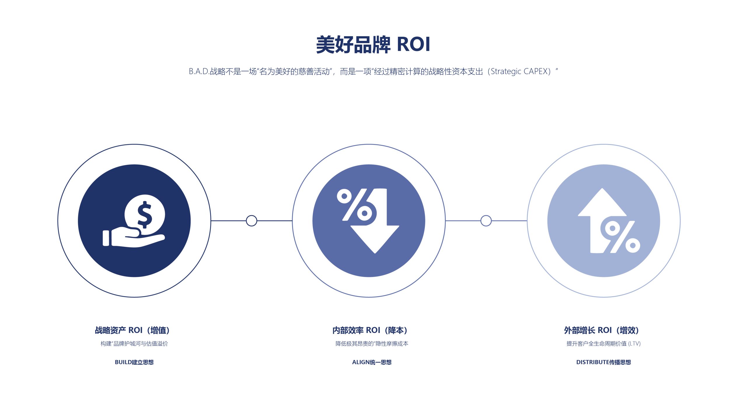 美好品牌战略(B.A.D.)是一套系统的解决方案,旨在解决传统“以利润为中心”企业模式的根本性缺陷,帮助企业从“混乱的战术堆砌”走向“清晰的价值输出”。该理论“BUILD建立思想”解决商业如何存在的问题,这一阶段是整个战略的灵魂和立心之本;“ALIGN统一思想”解决企业如何驱动的问题,这一阶段是整个战略的骨架和修身之道,确保品牌思想的内外贯通;“DISTRIBUTE传播思想”解决企业如何被感知的问题,这一阶段是整个战略的果实和发声之术。